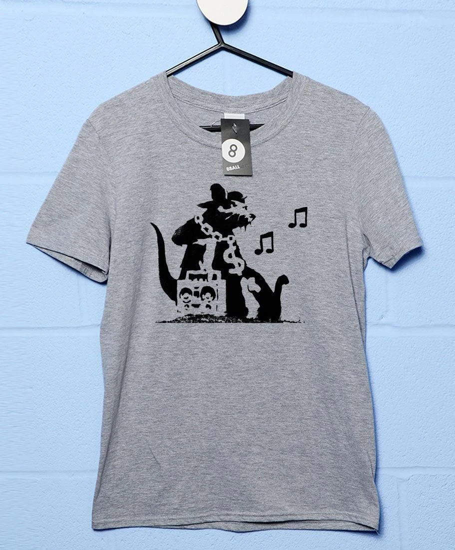 This Banksy t-shirt features an image of a ghetto-style rat with a large chain round its neck and a boom box. Also has musical note motifs. This is a 100% cotton Banksy T shirt. 10% of all royalties from our Banksy t-shirt range are donated to charity. You can find out more about the charities which 8Ball supports in the help section of our website. Thanks for your support.