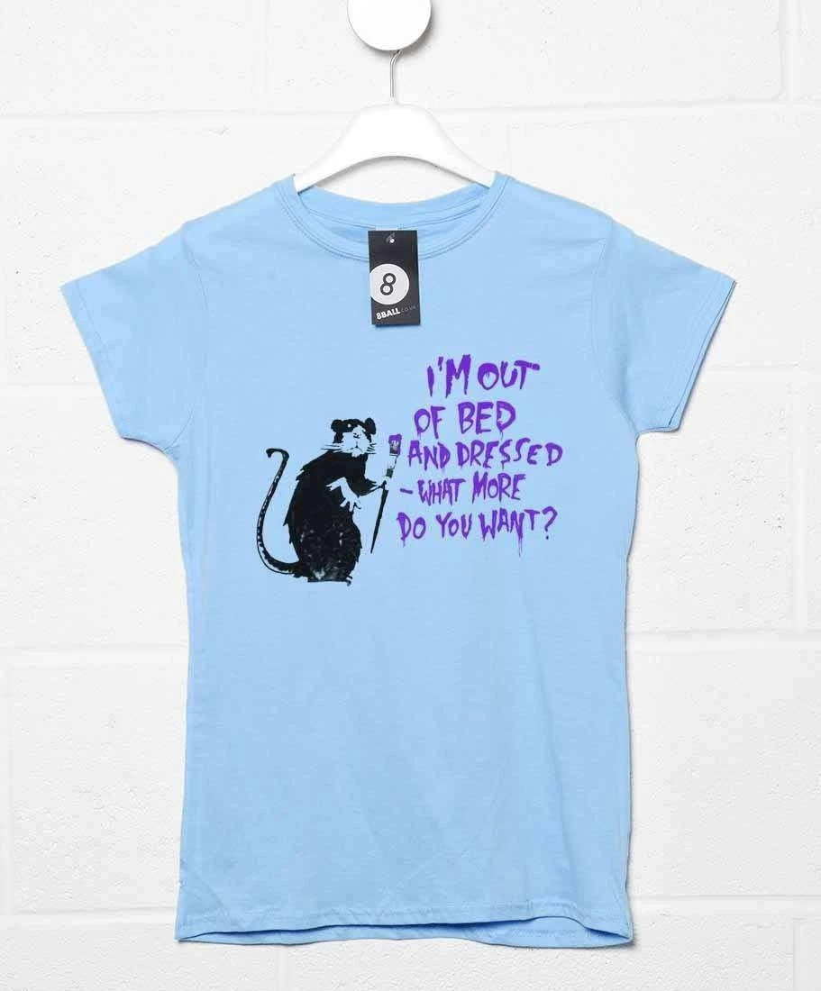 This womens Banksy tshirt has a print of one of Banksy’s designs showing a rat with a paintbrush, next to the hand-painted text “I’m out of bed and dressed – what more do you want?” This is the perfect slogan for all of us lazy people who drag ourselves out of bed at the last second, quickly pull on some clothes (including a great new Banksy t-shirt!) before going straight out of the door, usually late for whatever we are doing that day! This is a girls classic fit 100% cotton Banksy tshirt. 10% of all royalties from our Banksy t-shirt range are donated to charity. You can find out more about the charities which 8Ball supports in the help section of our website. Thanks for your support.