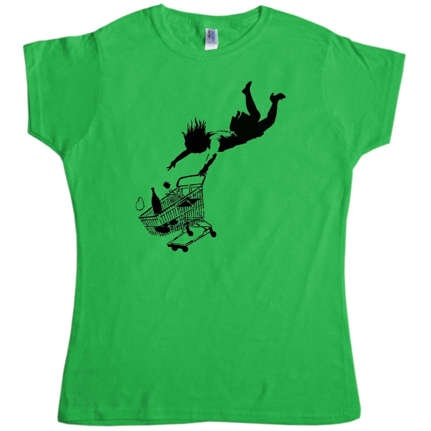 Banksy has taken the phrase ‘Shop til you drop’ literally herewith his graffiti piece which shows a woman plummeting through the air, shopping trolley and all! Like much of Banksy’s work, the meaning of this piece is not immediately obvious, but does it really matter? It’s a striking image that will look cool on your torso! This is a 100% cotton Banksy Shop til you drop t shirt.