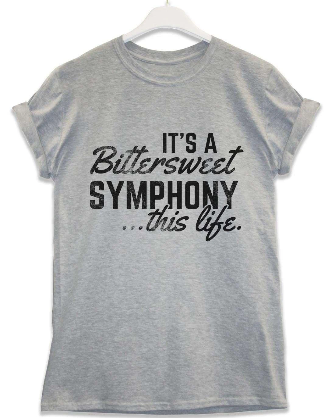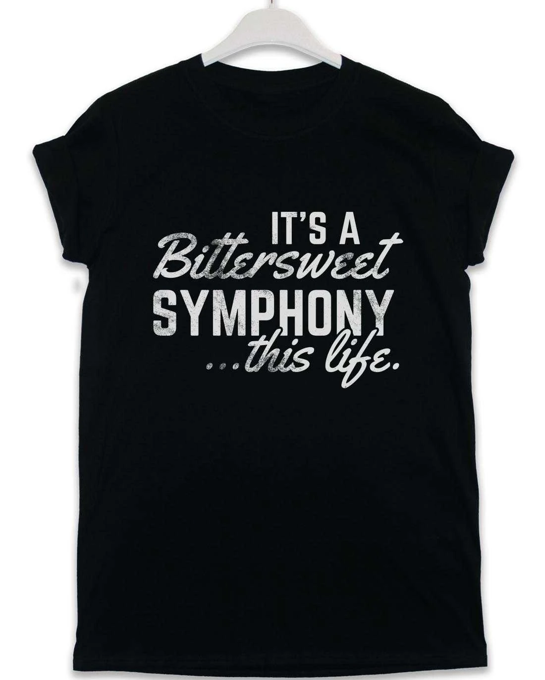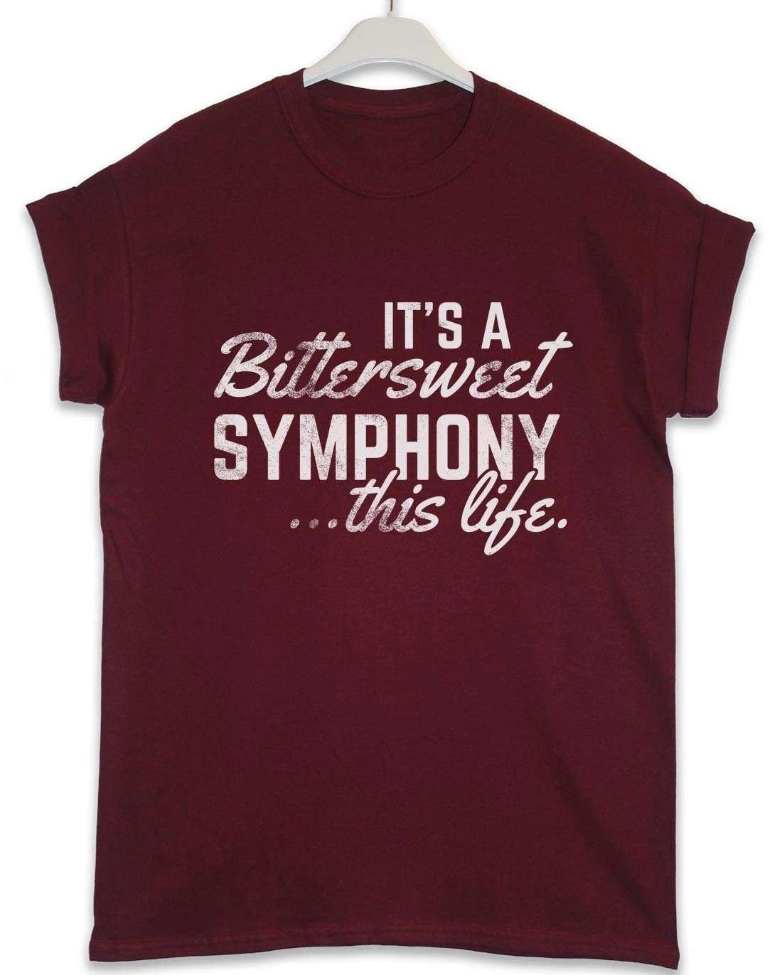 This t-shirt features a quote from the track Bitter Sweet Symphony, with an old-school, retro-look print that reads: “It’s a Bittersweet Symphony This Life”.