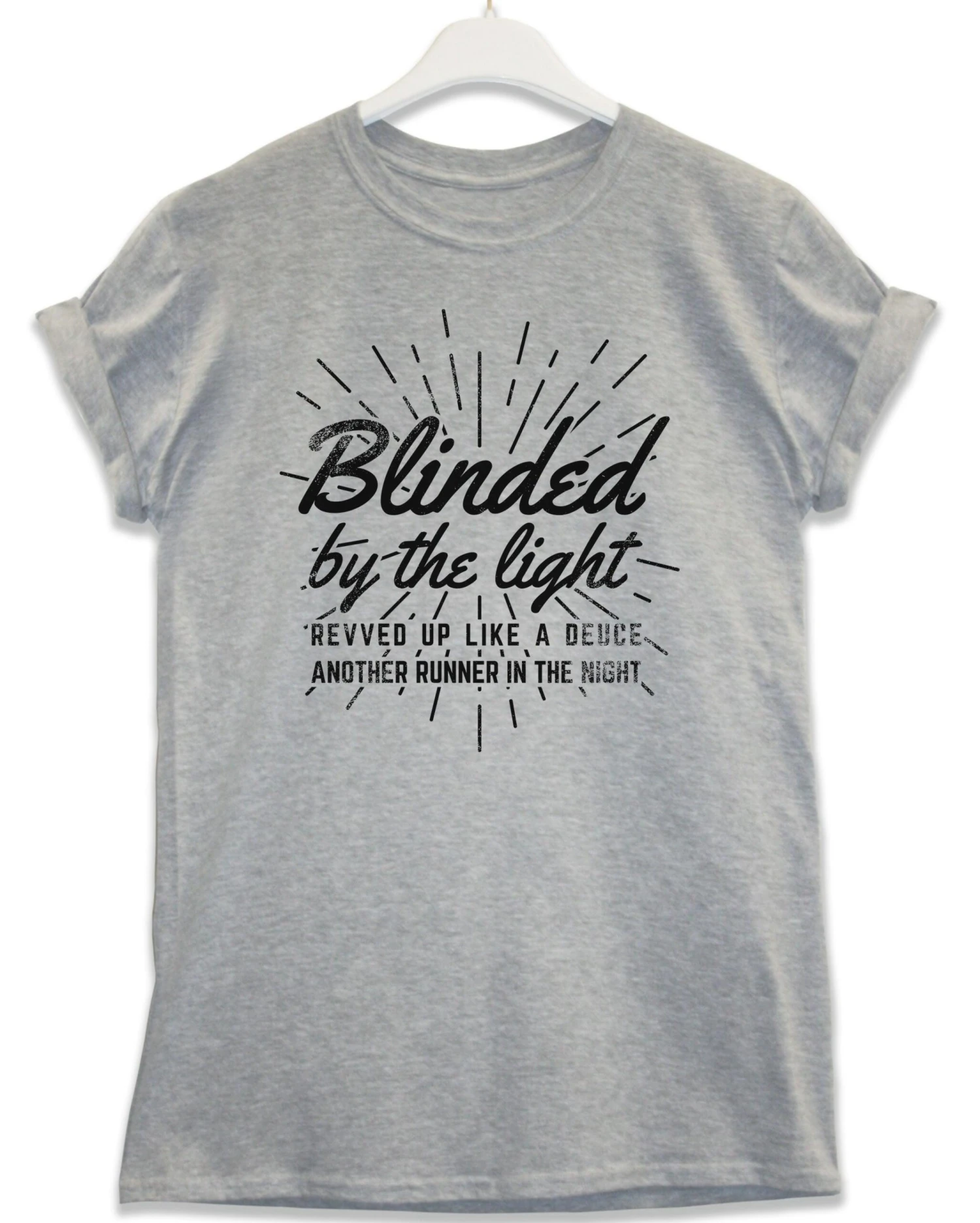 Distressed print of the lyrical quote: “Blinded by the light, revved up like a deuce, another runner in the night.”