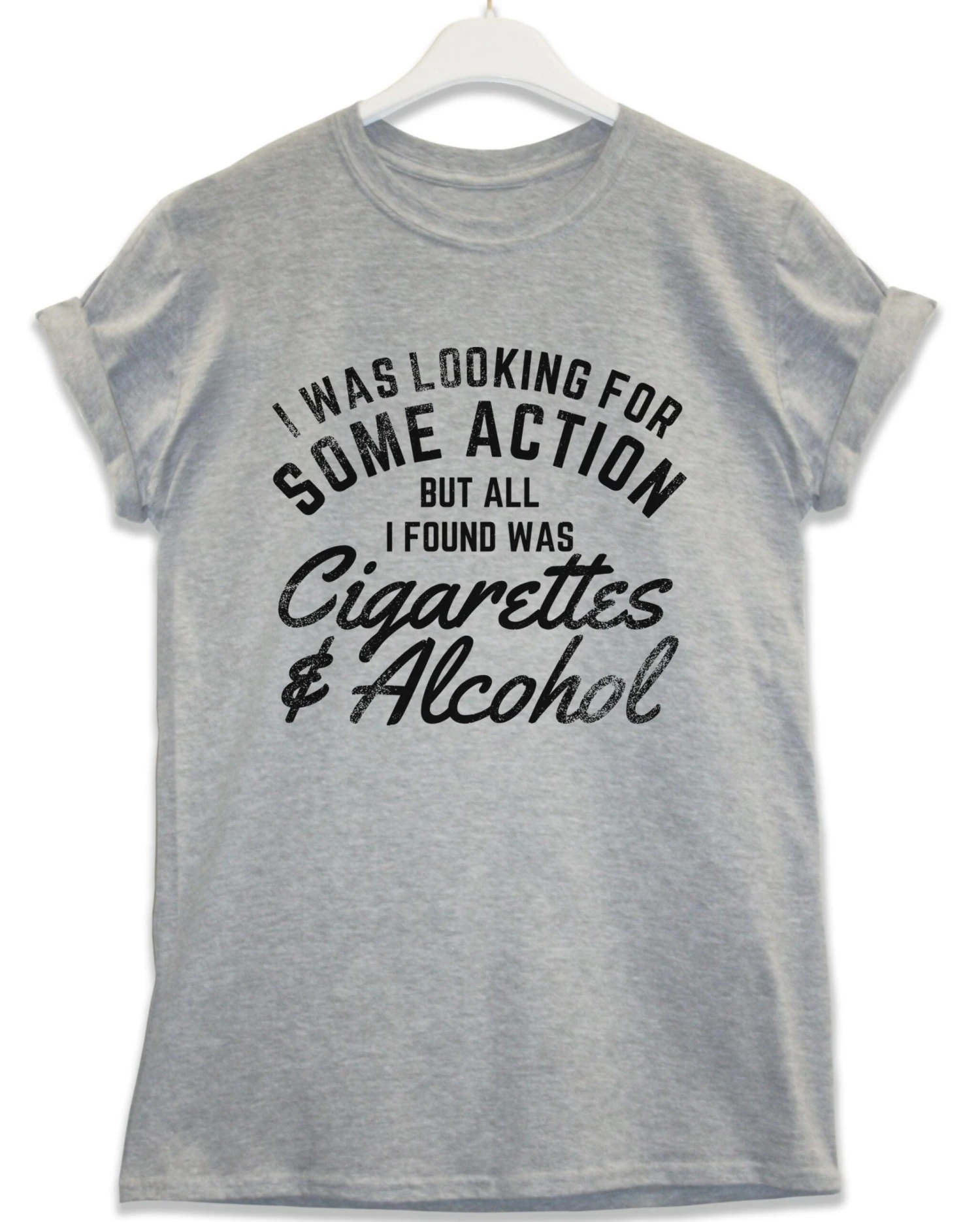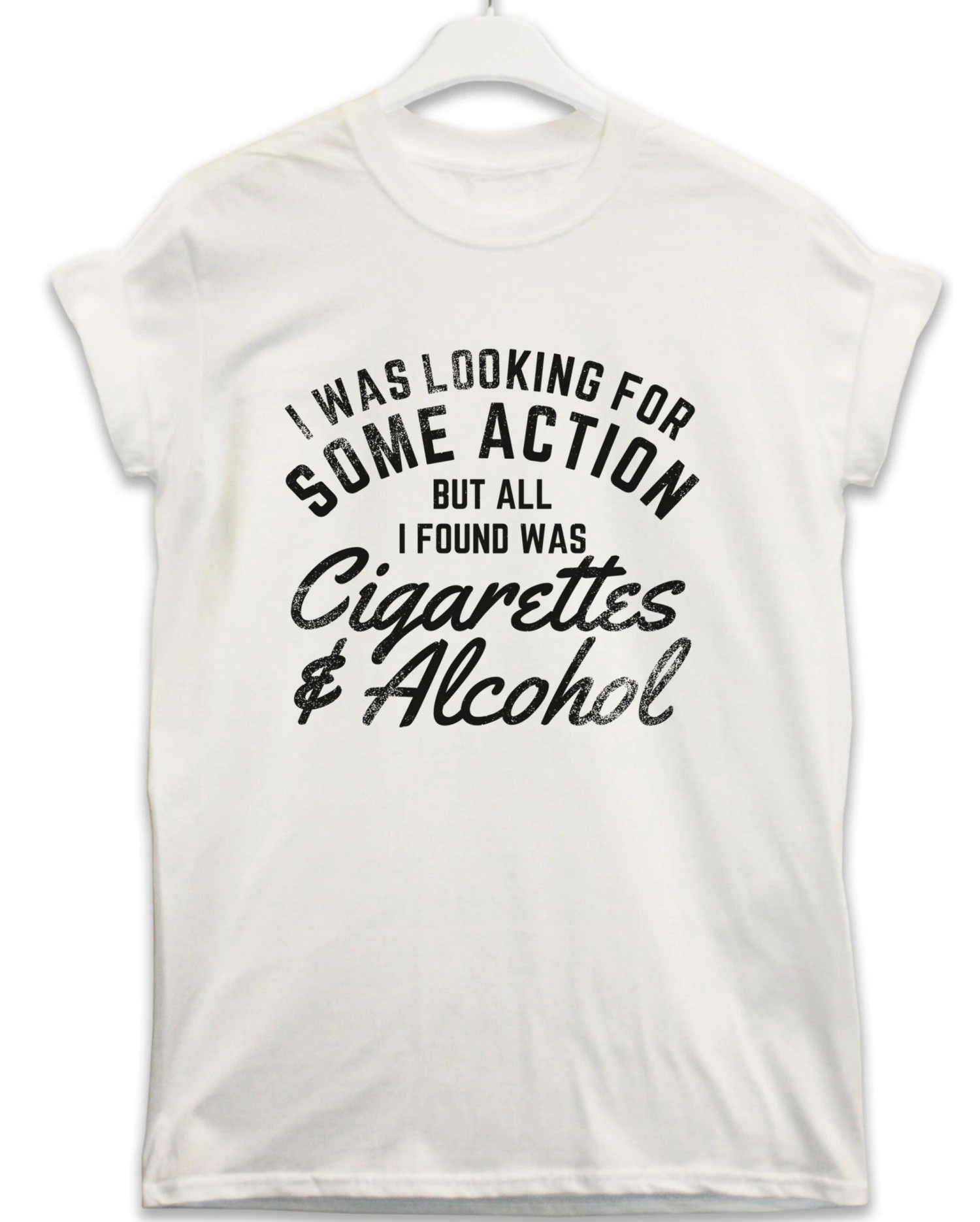Distressed print of the lyrical quote: “I was looking for some action, but all i found was cigarettes and alcohol”.