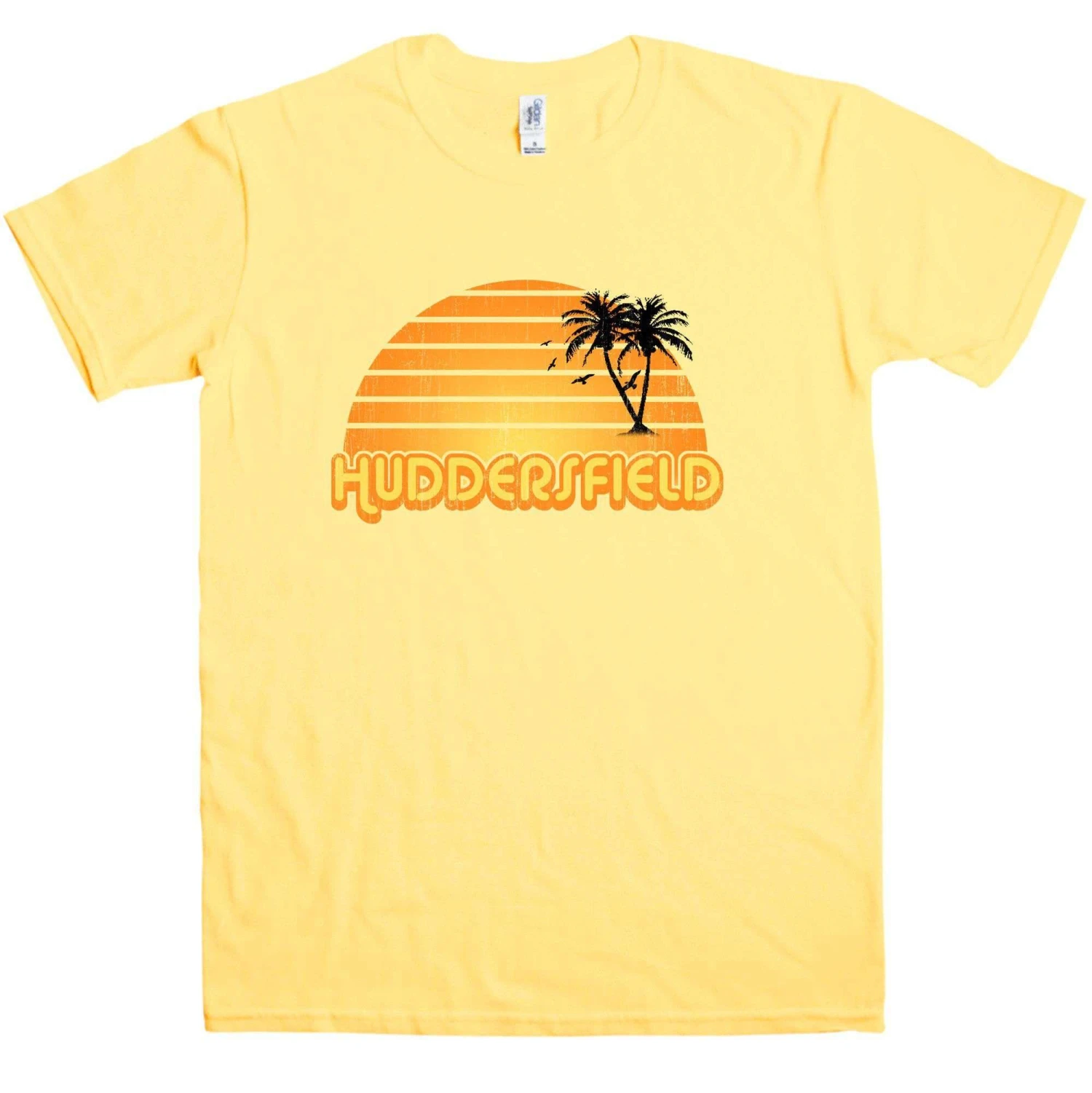 Who needs a beautiful sun drenched holiday with exotic palm trees when you live in good old Huddersfield? This funny retro t-shirt features a distressed, worn-look print of a Huddersfield souvenir design that looks like it was bought on a beach. Show love for Huddersfield and make your mates laugh at the same time with this 100% cotton City Sunsets Huddersfield t shirt.
