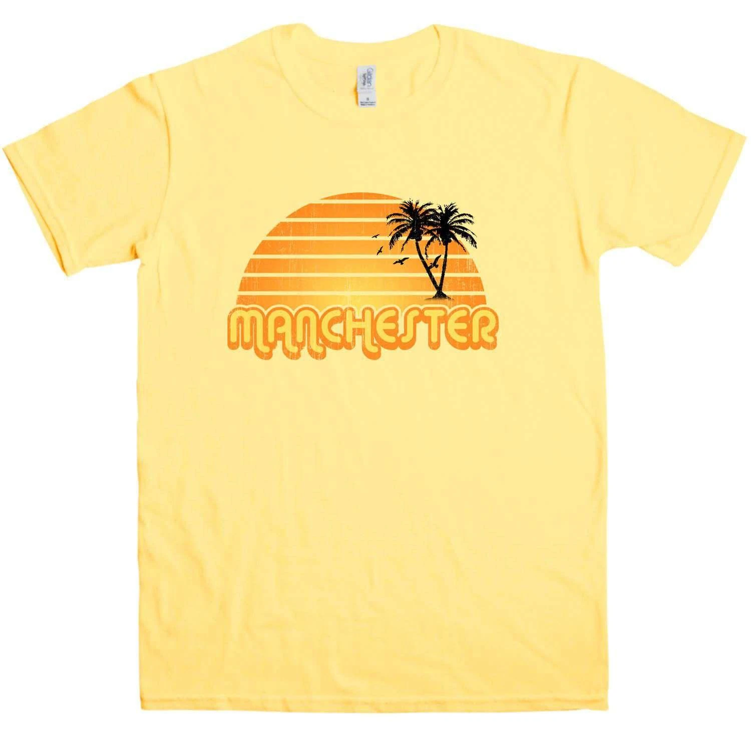 Show everyone how much you love Manchester with this funny spoof souvenir t shirt. Although the design looks as though you bought it on holiday somewhere, it has a Manchester logo instead! The print has a distressed effect to make it even more retro. This is a 100% cotton City Sunsets Manchester t shirt.