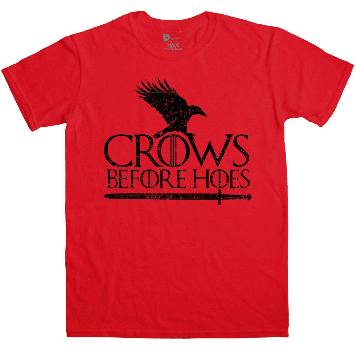 This comedy TV tee features the slogan Crows Before Hoes with a graphic of a crow hovering over the slogan with a sword underlining it. The overall design has a distressed finish. The crow and the Raven both hold a huge symbolic status in the show hence this spoof slogan tee perfect for any fan of the show.