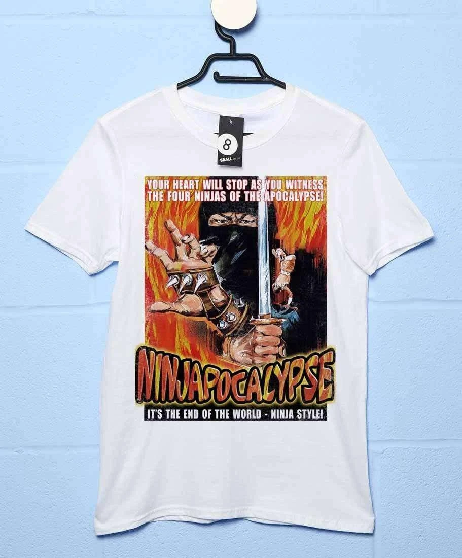 This martial arts fitted style t-shirt from Deathray features a old-look distressed print of poster artwork showing a ninja with a sword and flames behind him, with the tagline “Your heart will stop as you witness the four ninjas of the apocalypse” and the title “Ninjapocalypse”. The poster also tells us that “It’s the end of the world – Ninja style!” A great retro tee made from super soft brushed cotton for fans of old school kung fu movies.