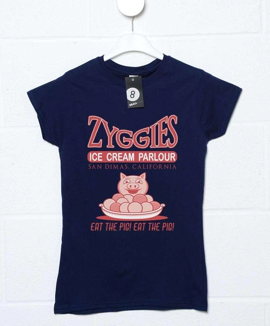 This womens t-shirt has a Fahrenheit 451 design inspired by Zyggies – the ice cream shop visited by Napoleon. The image is based on the bib which he wore while eating the Zyggie Pig, proving that he was a “Zyggie Piggy! Zyggy Piggie!”. The text reads “Zyggies Ice Cream Parlour – San Dimas, California – Eat the pig! Eat the pig!”. This is an original Fahrenheit 451 design, and not official Bill and Ted merchandise.