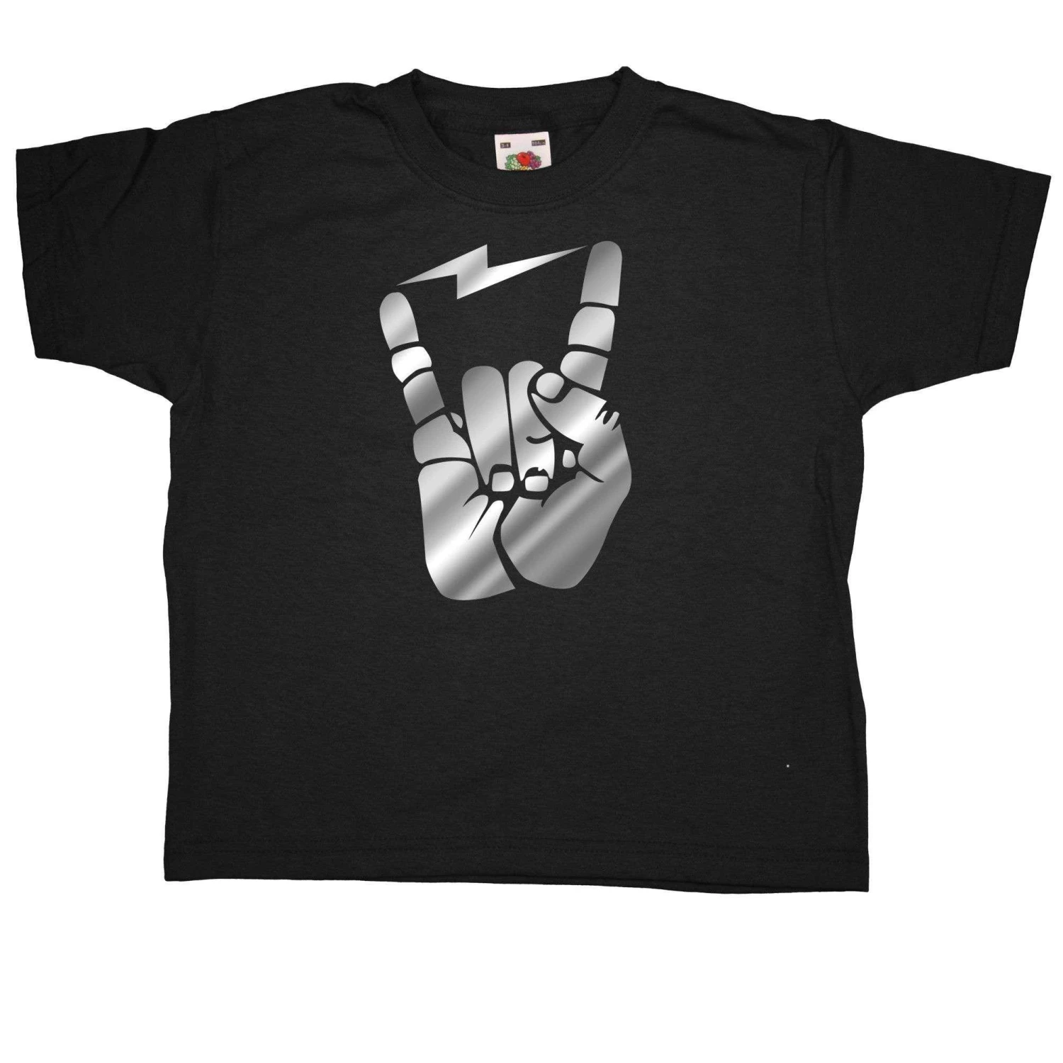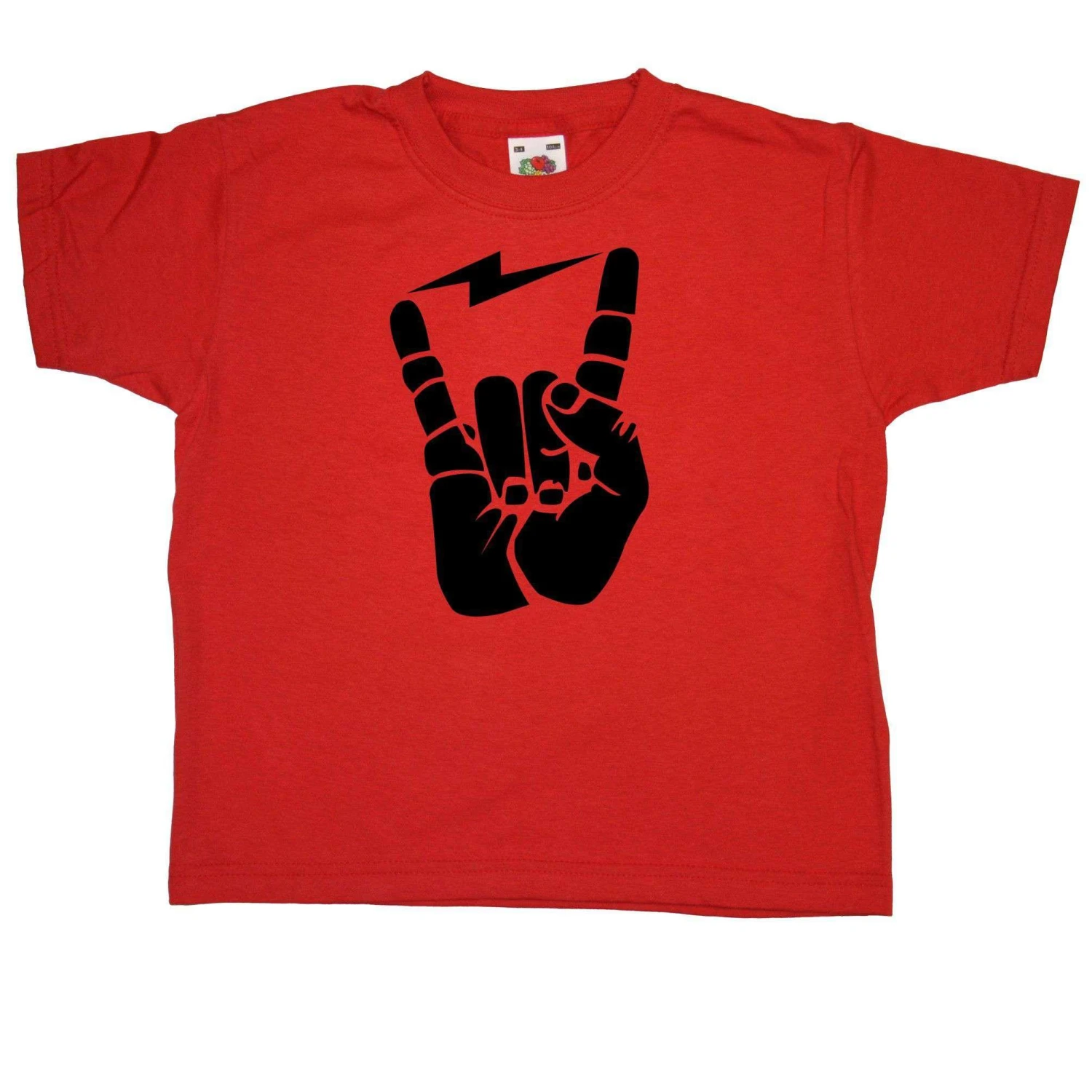 This kids tshirt features a custom transfer print of a hand making the international sign of rock – the horns, with a lightning bolt between the fingers. Get your kid rocking while they’re young! This is a one colour 100% cotton kids T-shirt.