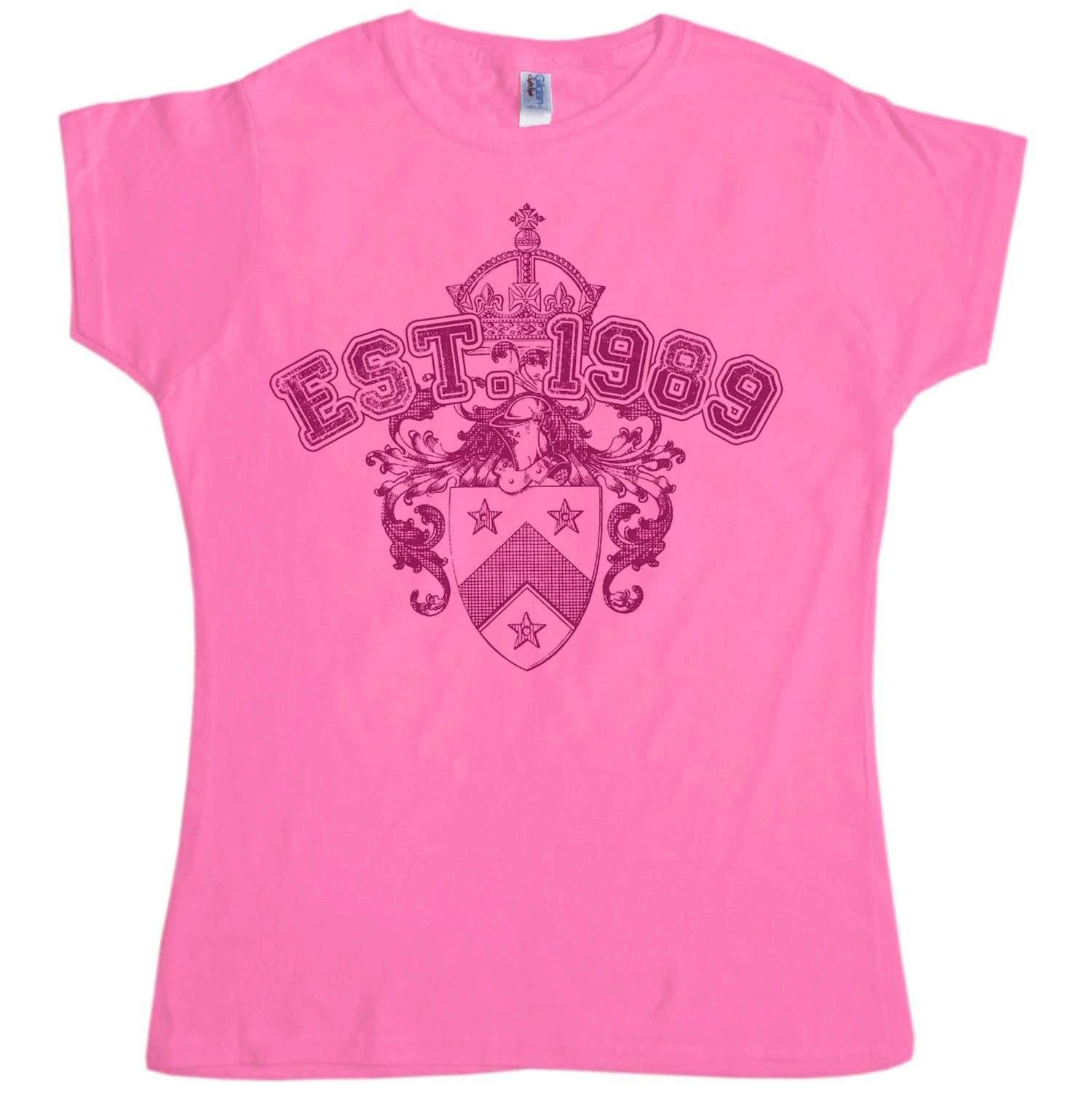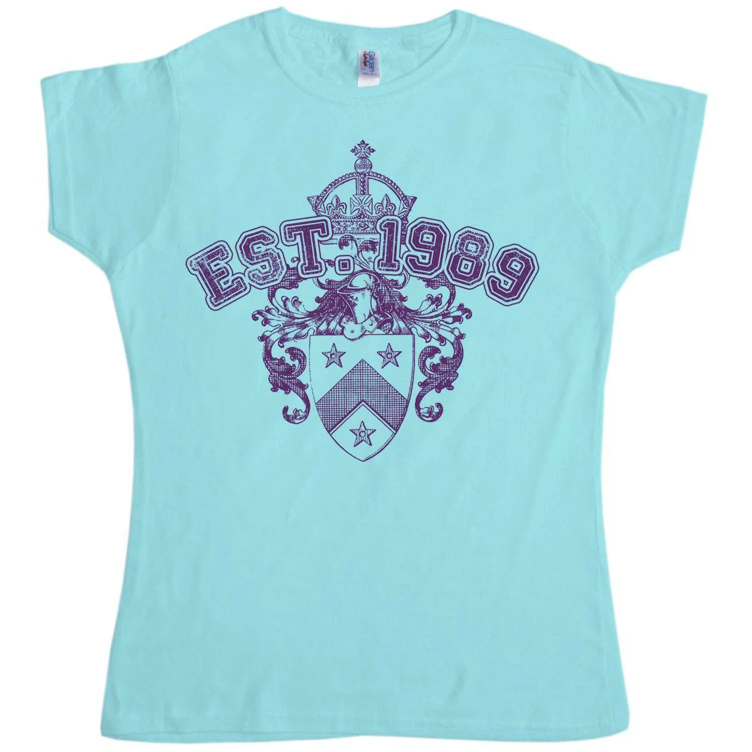 This t-shirt features a retro image of a knights helmet, a shield motif and a crown with a distressed print of the slogan “Est. 1989”. Whether you’re looking for a present for somebody who was born in ’89 or you were born in ’89 yourself, this is the tee to get. This is a 100% cotton Est. 1989 t shirt.