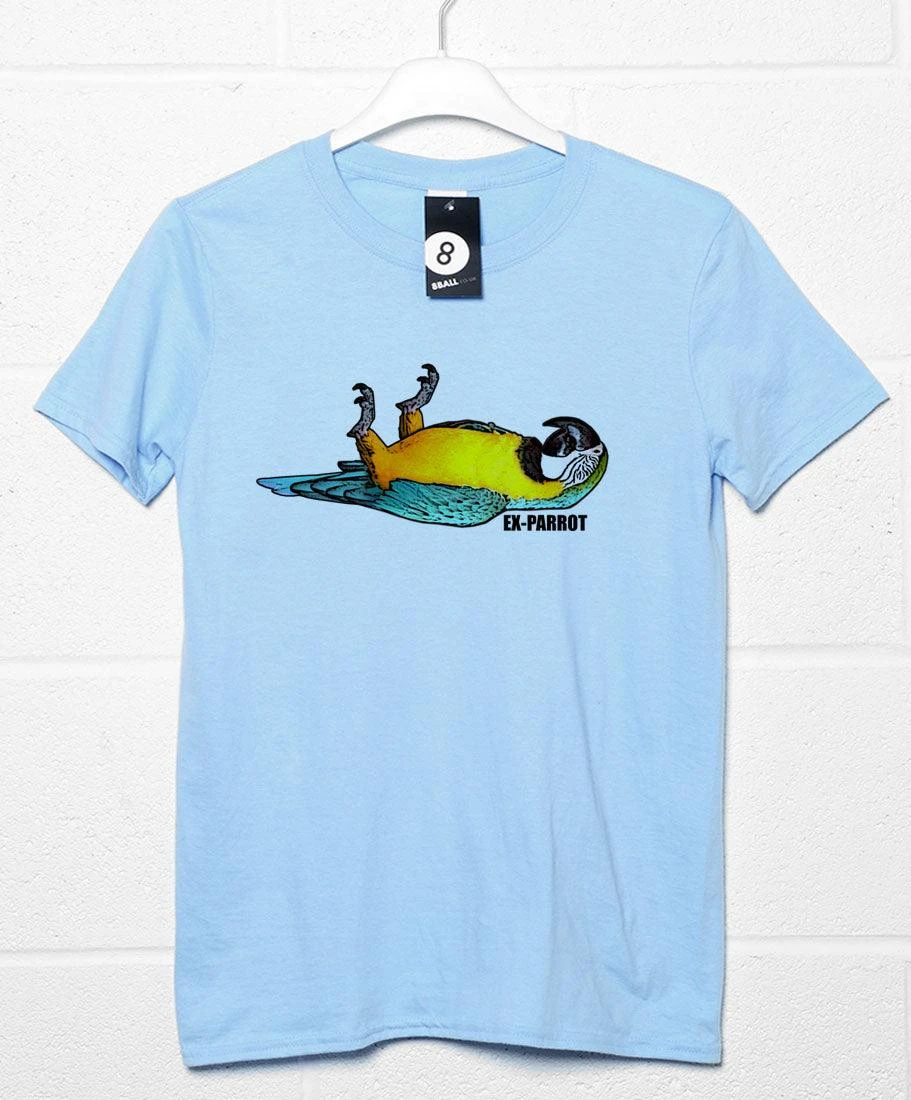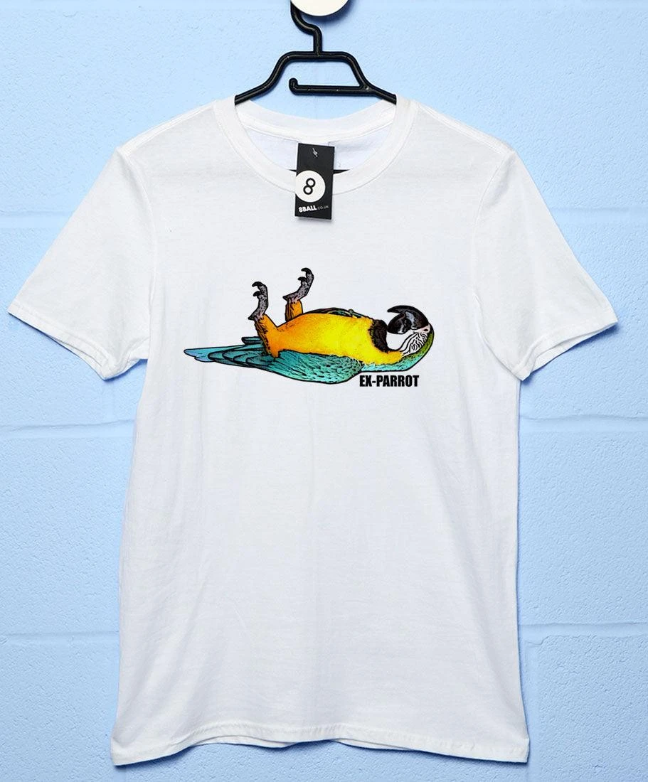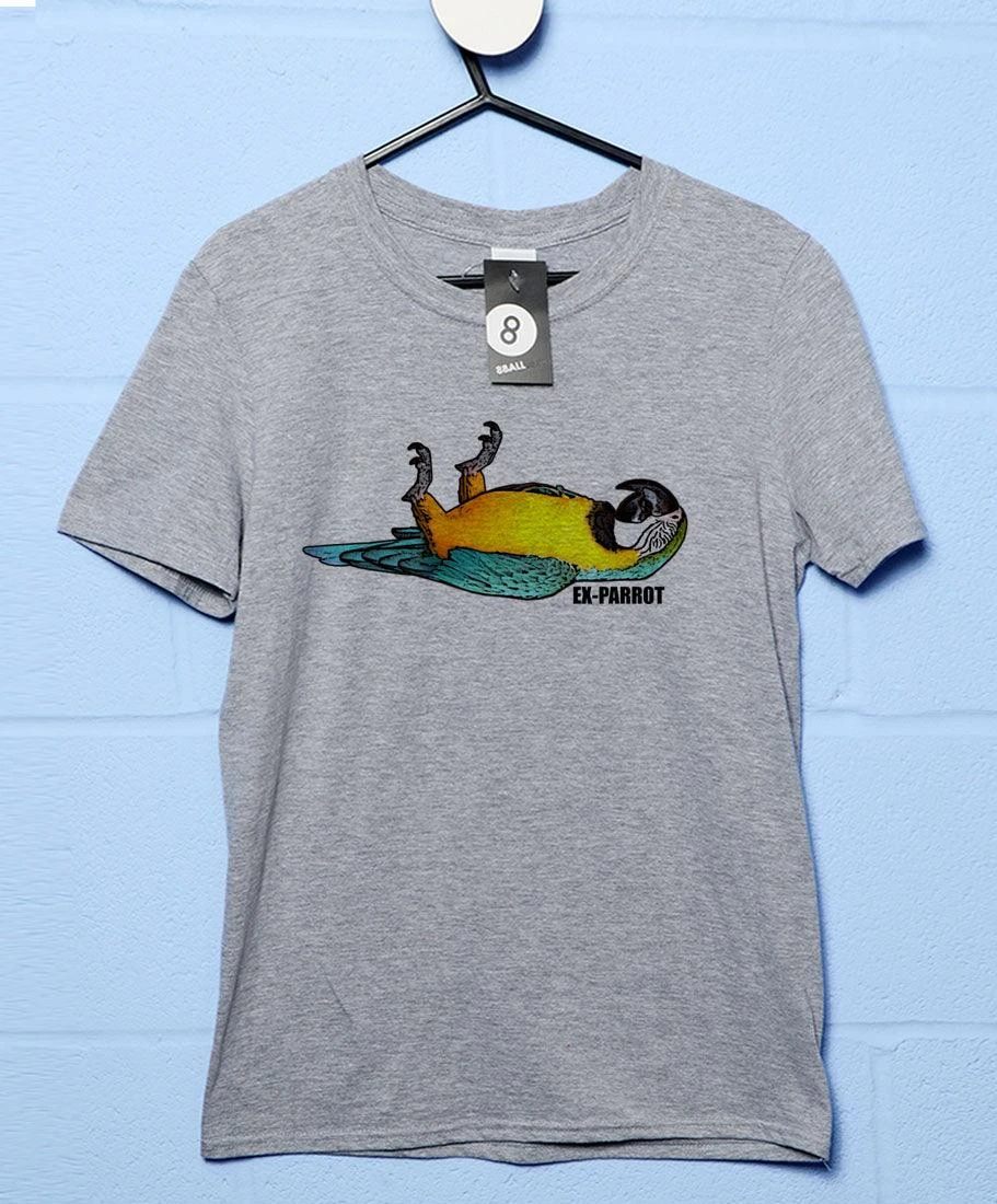 This Monty Python inspired t-shirt features an image of a dead parrot in homage to the classic Monty Python Dead Parrot Sketch. Has a small ‘Ex Parrot’ slogan underneath. Look matey, I know a t-shirt with a picture of a dead parrot on when I see one, and I’m looking at one right now! Or maybe he’s just stunned… This is a 100% cotton funny dead parrot t-shirt in homage to the classic Python sketch. Please note this is not an official Monty Python product.