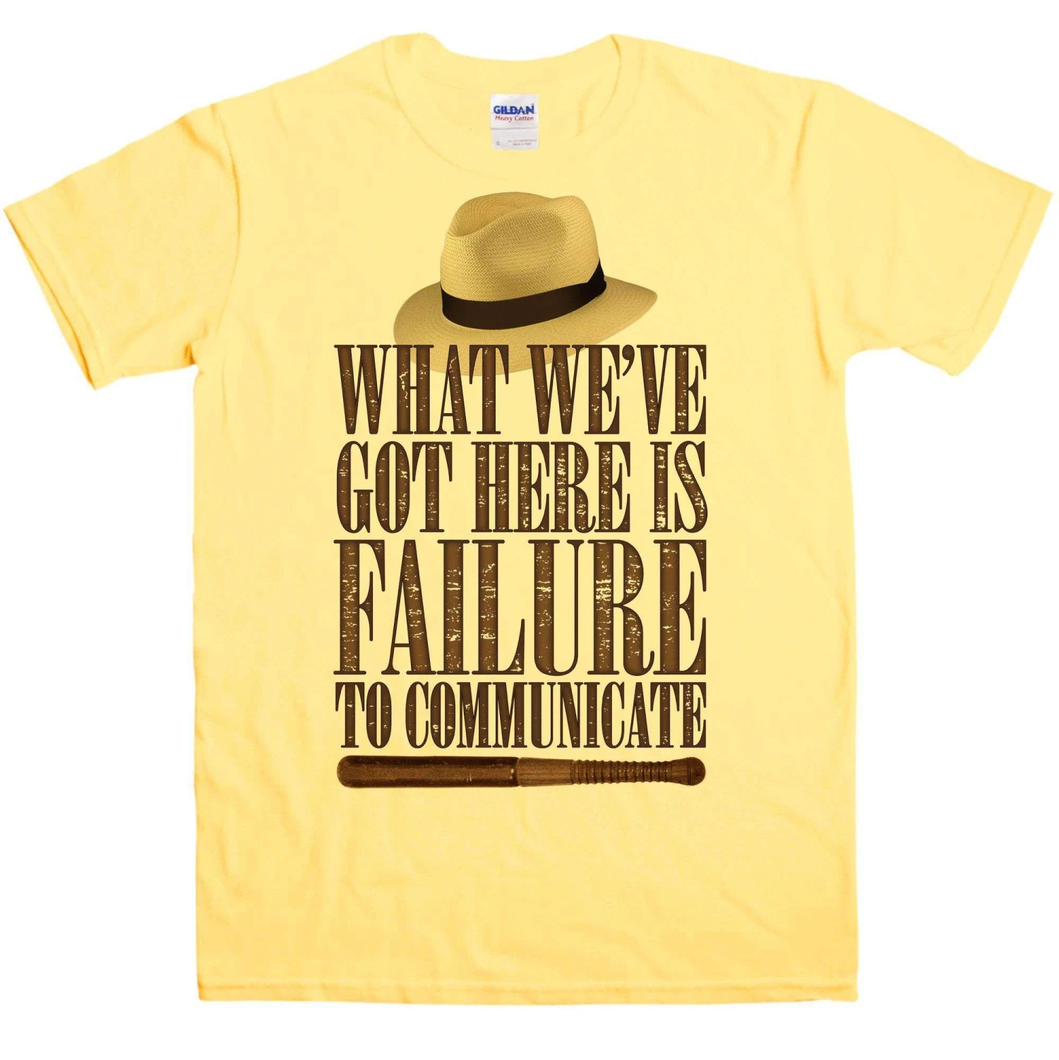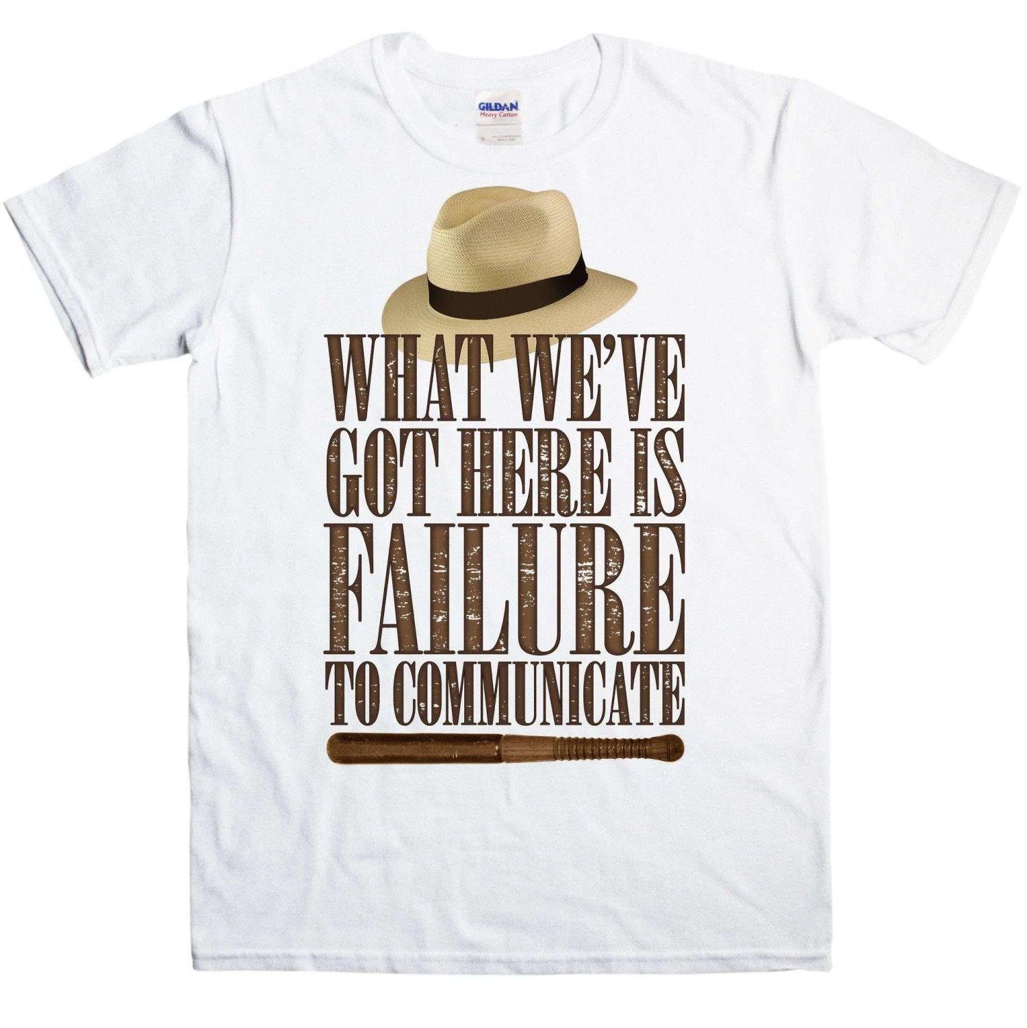 This Cool Hand Luke inspire t hsirt features a design which includes the famous line said by the Captain (Strother Martin) to Luke (Paul Newman): “What we’ve got here is failure to communicate”. Also has an image of a hat and a truncheon like the ones sported by Captain in the movie. This is a 100% cotton t-shirt inspired by the 1967 movie Cool Hand Luke, not a licensed product.