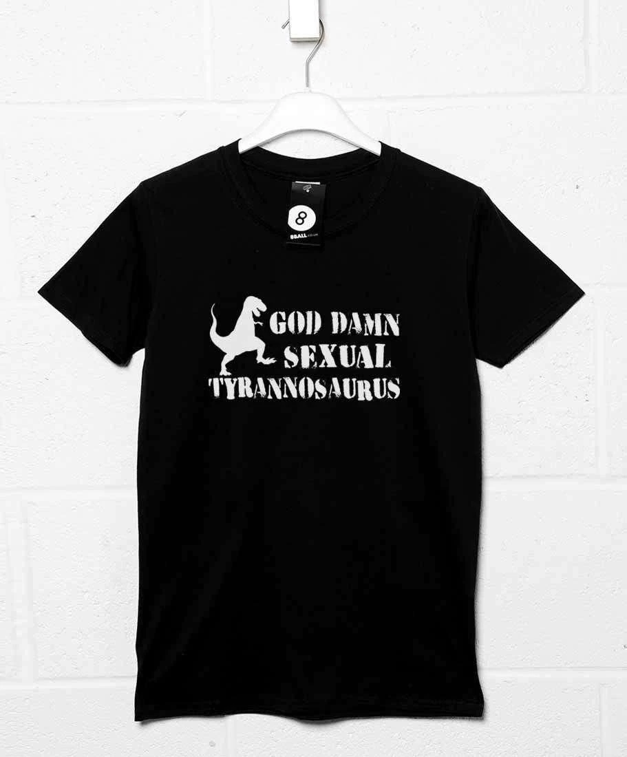 This Predator inspired t-shirt features the slogan “God Damn Sexual Tyrannosaurus” in a stencil-sprayed army style font. This slogan comes from Blain as played by Jesse ‘The Body’ Ventura who says that chewing tobacco will make you into a god damn sexual tyrannosaurus just like him. Also has a silhouette image of a Tyrannosaurus Rex. This is a 100% cotton inspired by Predator t-shirt. Not official Predator merchandise.