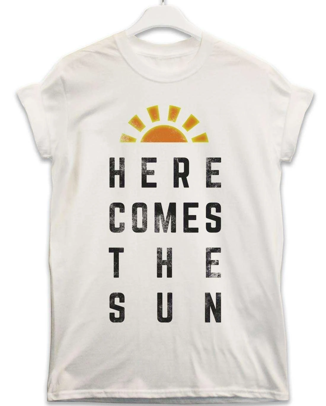 This tee quotes the song Here Comes the Sun, with a distressed, vintage-look print of the lyrics with a rising sun motif above.