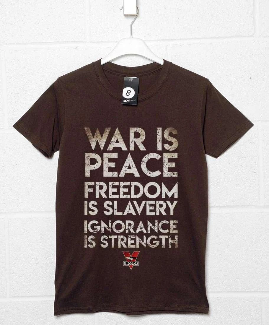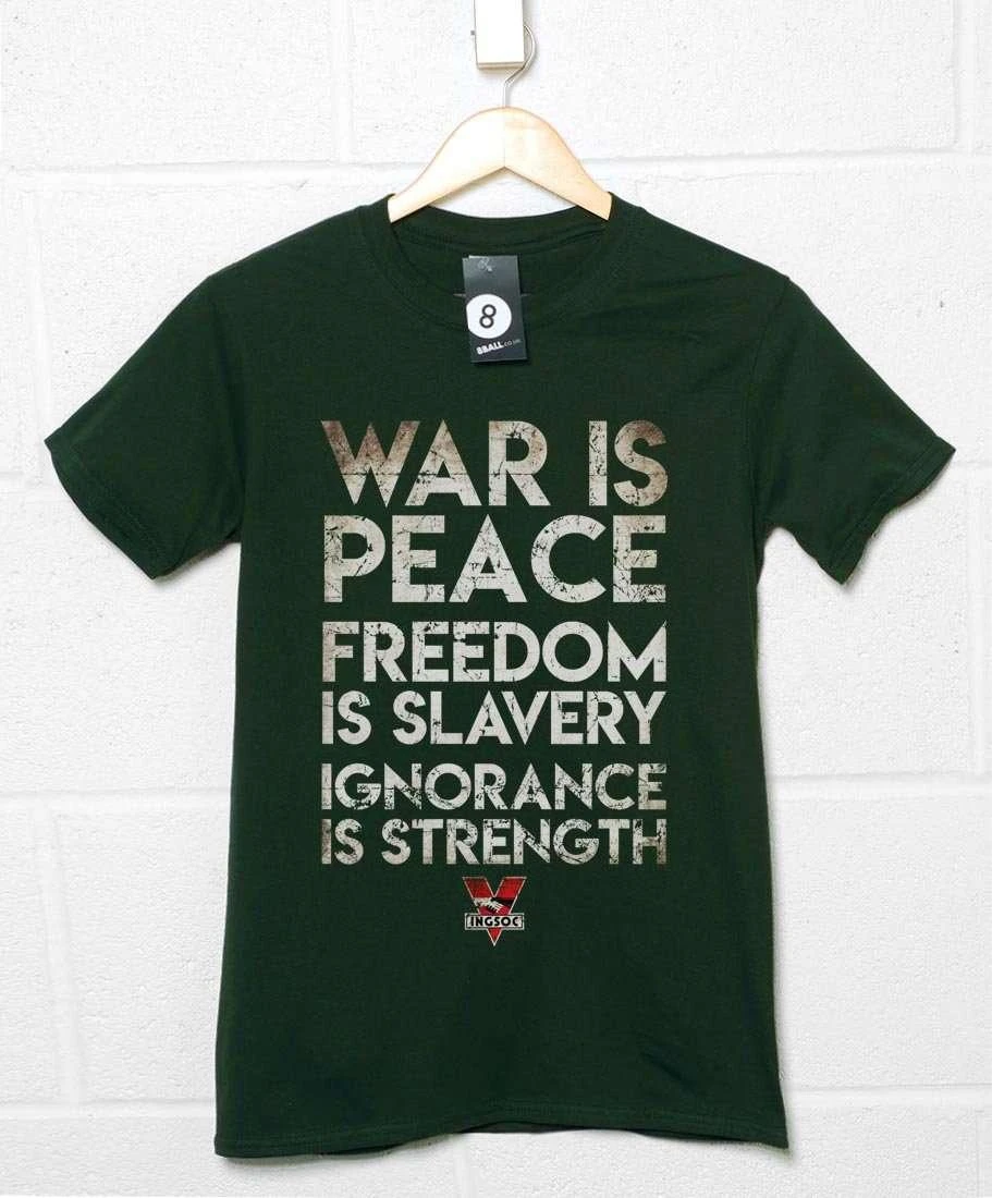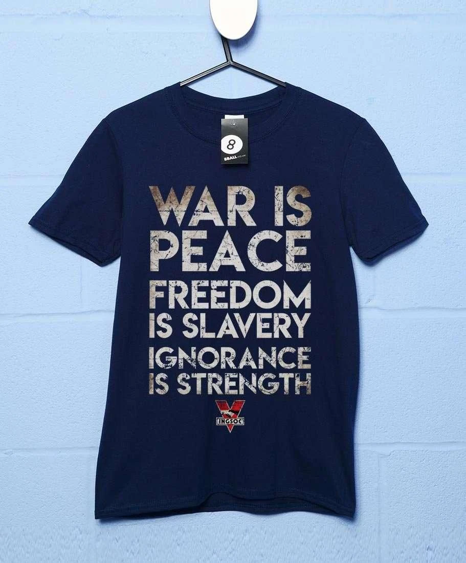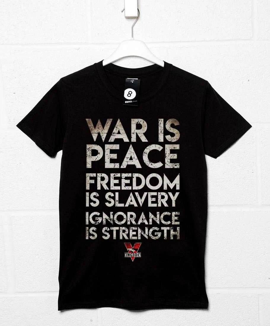 War is Peace! Freedom is Slavery! Ignorance is Strength! Show your loyalty to Big Brother by proudly wearing the slogans of The Party on your chest. Be sure look out for thoughtcriminals who may commit ungood facecrime after reading your t-shirt and report them to the Thought Police without delay.