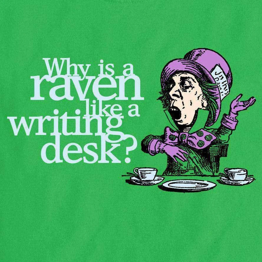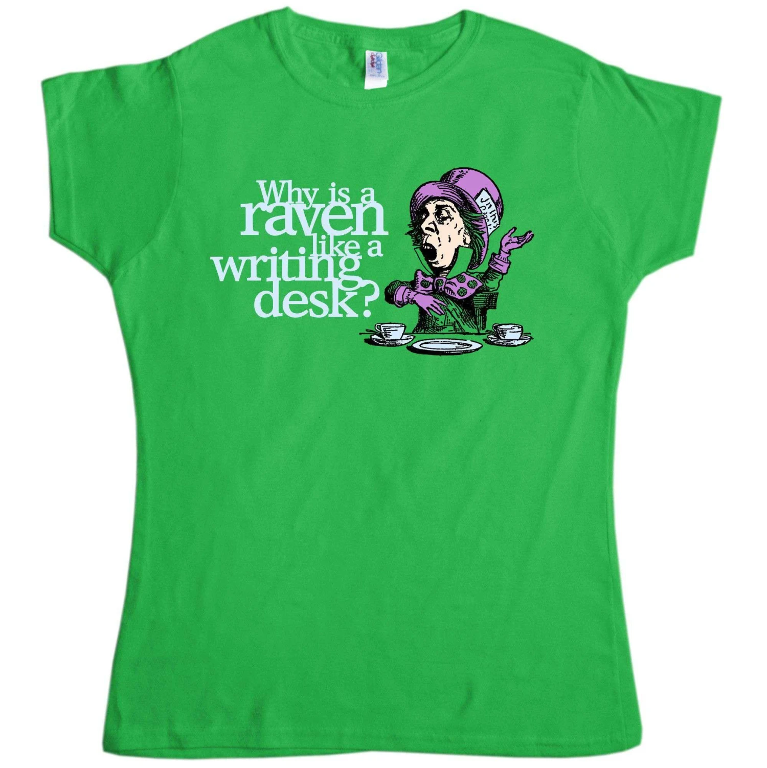 This Mad Hatter ladies t-shirt has an image of the loony tea party host as he first appeared in Lewis Carroll’s 1865 book ‘Alice in Wonderland’. The t-shirt shows the Hatter at his tea table, surrounded by cups and plates. Has his famous riddle “Why is a raven like a writing desk?” printed next to him, the answer to which was of course “I have no idea”. The Hatter was portrayed by Johnny Depp in Tim Burton’s movie version. Show love for one of the best characters of all time with this girl’s Alice in Wonderland t shirt.