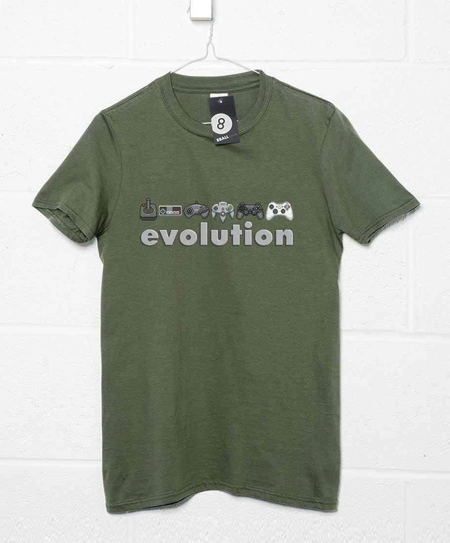 This t-shirt features an original design created with pixels in the style of retro video game graphics. Shows a progression of video game controllers from the early retro joystick through to modern game pads we are all familiar with today. Has the slogan “Evolution” underneath, also in a blocky, pixellated style. This is a 100% cotton t-shirt with an original design, not licensed merchandise.