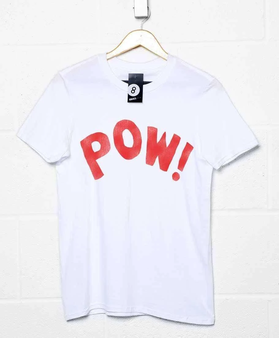 This t-shirt is inspired by a top worn by The Who’s iconic drummer Keith Moon during the bands early years. Features the slogan “Pow!” in a wonky, cut-out style font. Printed with a distressed, slightly faded effect for retro authenticity. Available with a red or a black print. This is a 100% cotton white t-shirt inspired by a design worn by Keith Moon, but not officially licensed in any way.