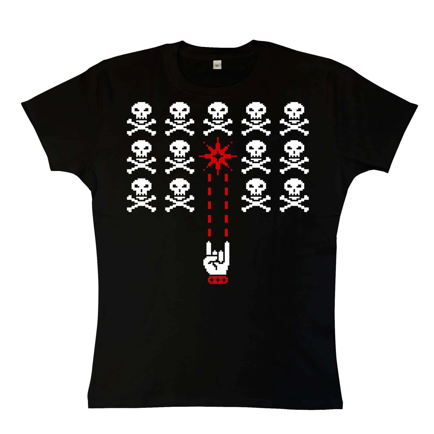 This girls t-shirt features a two colour print of a space invaders style design. Instead of alien ships, there are skull and crossbones motifs, and the players ship has been replaced by a hand making the international sign of rock! This is a girls classic fit 100% cotton skull invaders T-shirt.