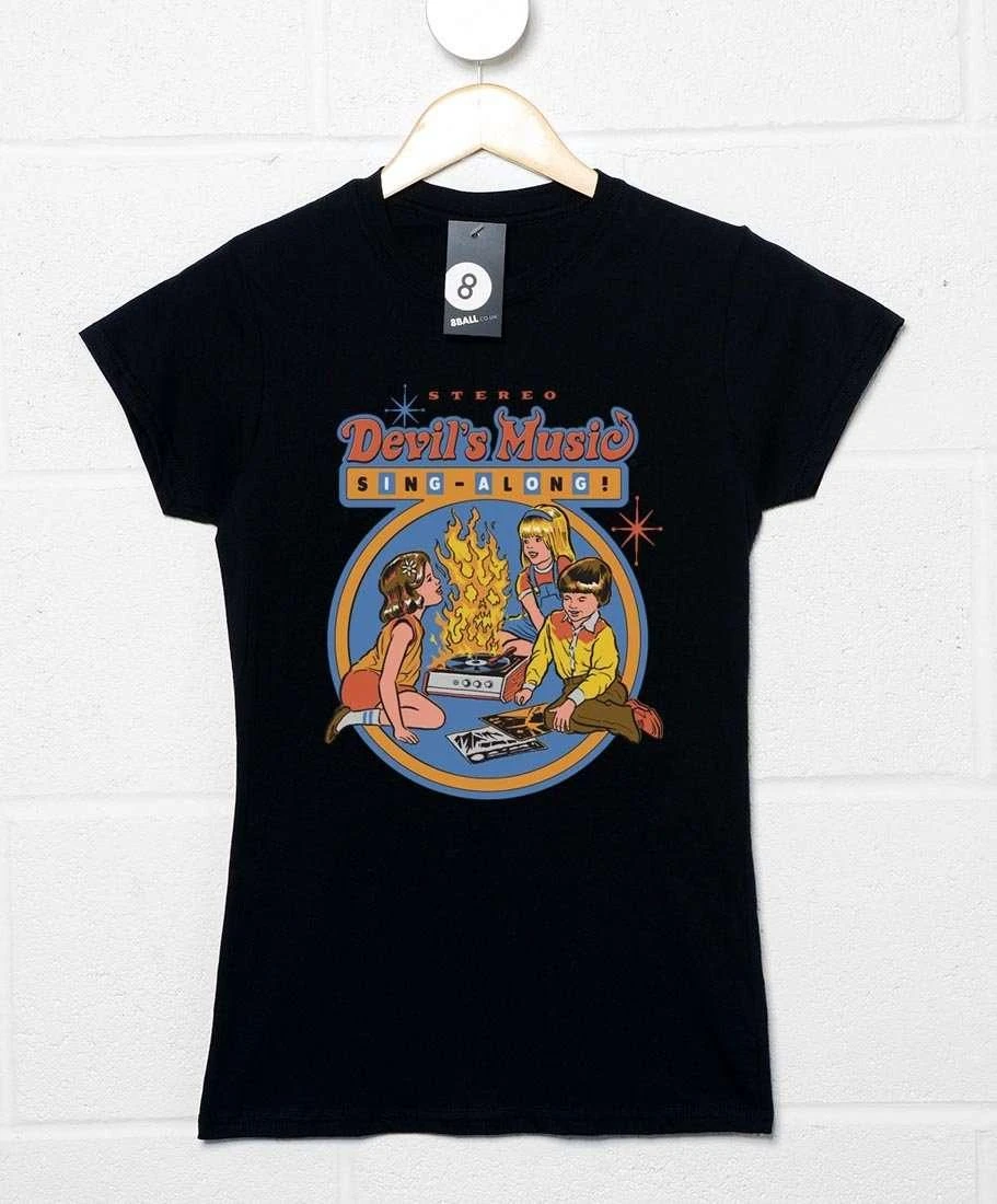 Listen to the Devil’s Music, all the cool kids are doing it! Form independent designer Steven Rhodes, this fitted-style womens tee shows some kids listening to evil music on their burning record player, in the style of a retro children’s book.