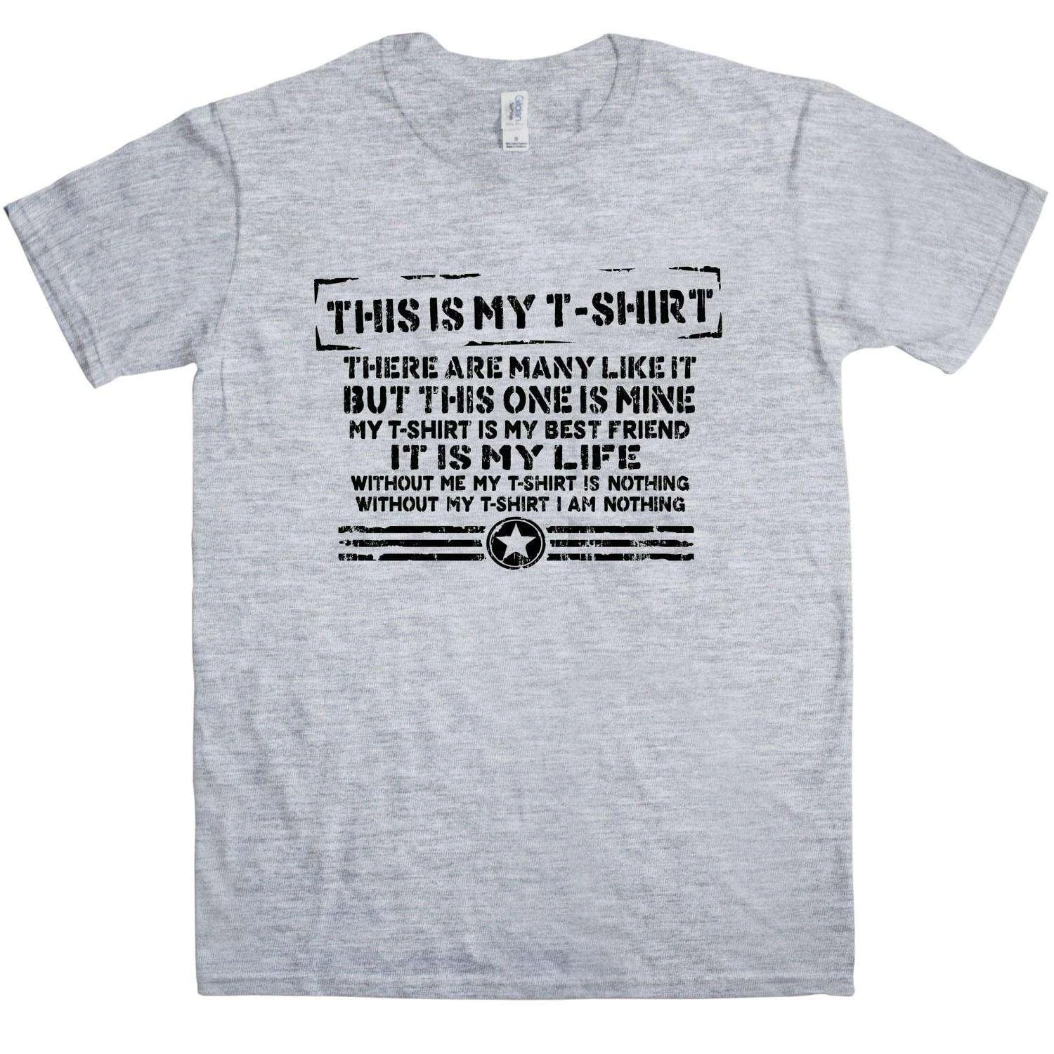 This funny t-shirt is a parody of the “Riflemans Creed” which is the mantra of the US Marines, famously tought to the recruits in Stanley Kubrick’s Full Metal Jacket by Gunnery Sergeant Hartman, played by R. Lee Emery. Instead of saying “this is my rifle…” the mantra has been changed to “this is my t-shirt, there are many like it but this one is mine. My t-shirt is my best friend, it is my life. My t-shirt without me is useless, without my t-shirt I am useless.” Now all you need to do is give it a girls name! This is a 100% cotton khaki t-shirt with a custom black print.